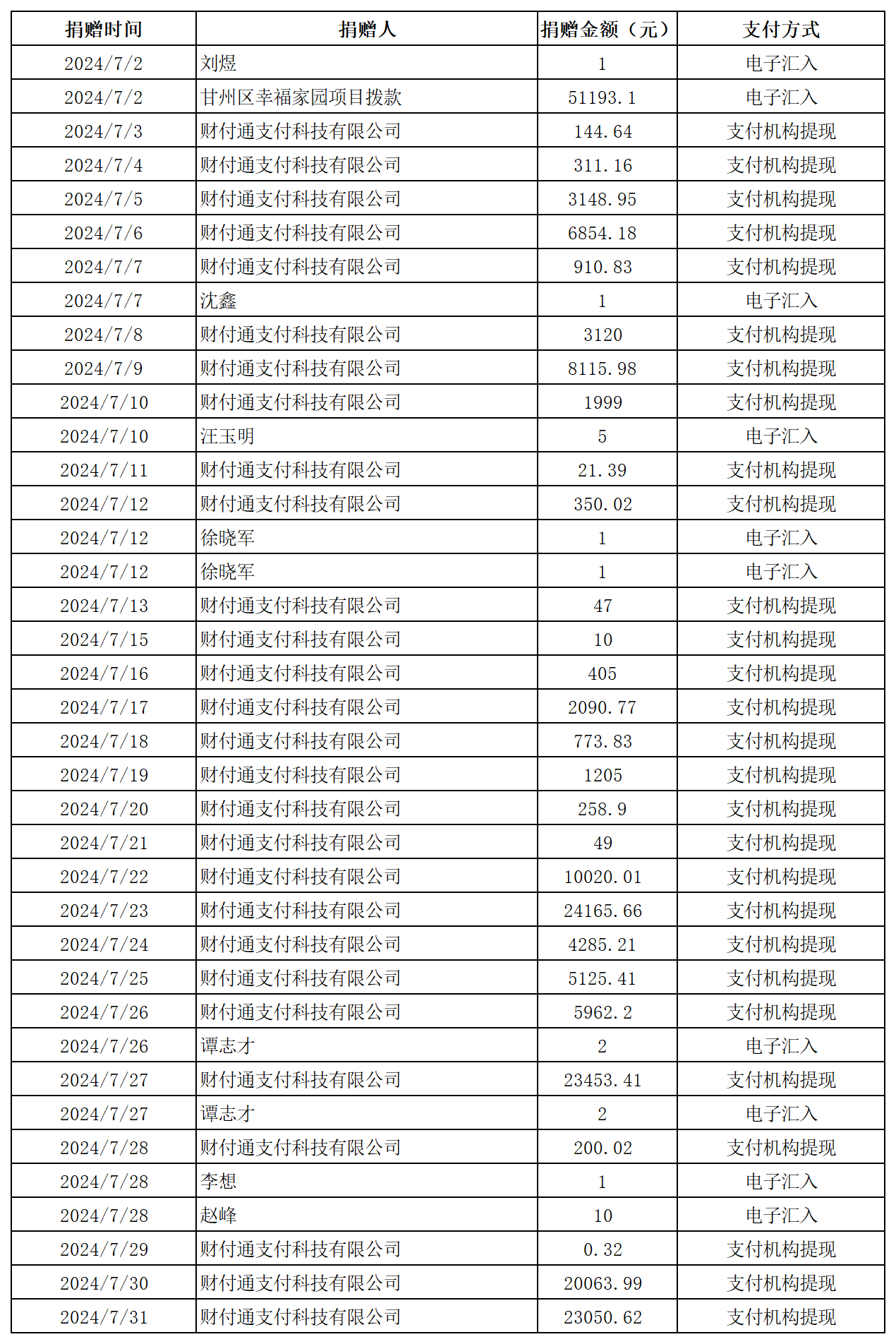 2024年張掖市慈善協(xié)會積極搭建愛心平臺,得到廣大愛心人士和愛心單位積極響應,踴躍捐款捐物,現(xiàn)將(2024年7月1日--7月31日)接收到的銀行轉賬收入公示如下: